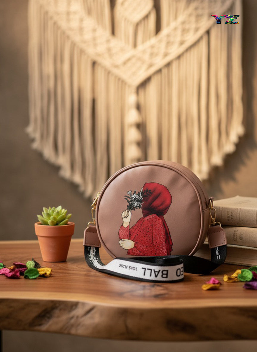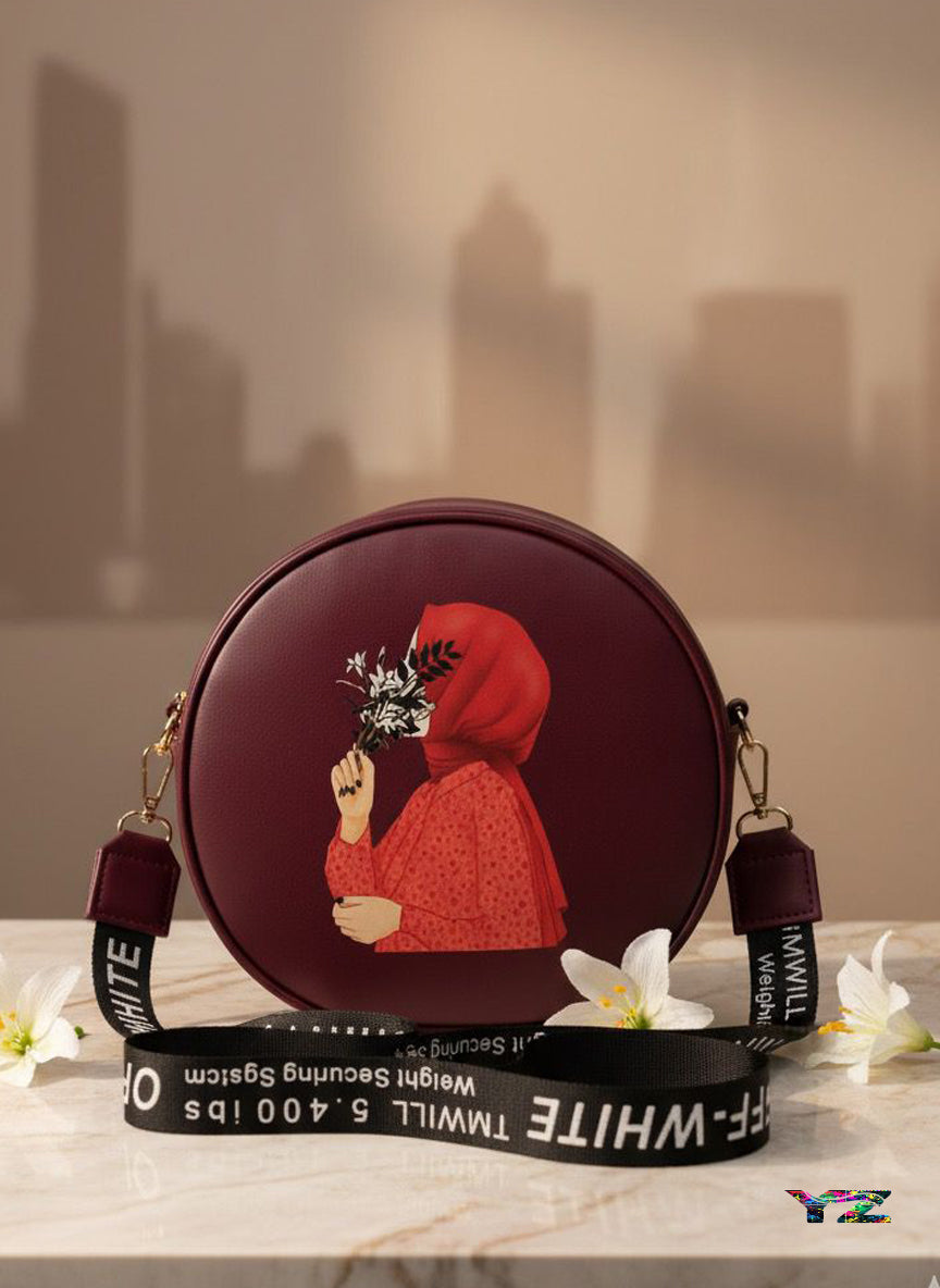 Elevate your style with this beautifully crafted Hijab round handbag featuring a captivating illustration of a woman in a red hijab holding a delicate bouquet of flowers — a symbol of grace, mystery, and elegance. Made from premium quality faux leather, the bag offers both durability and sophistication.