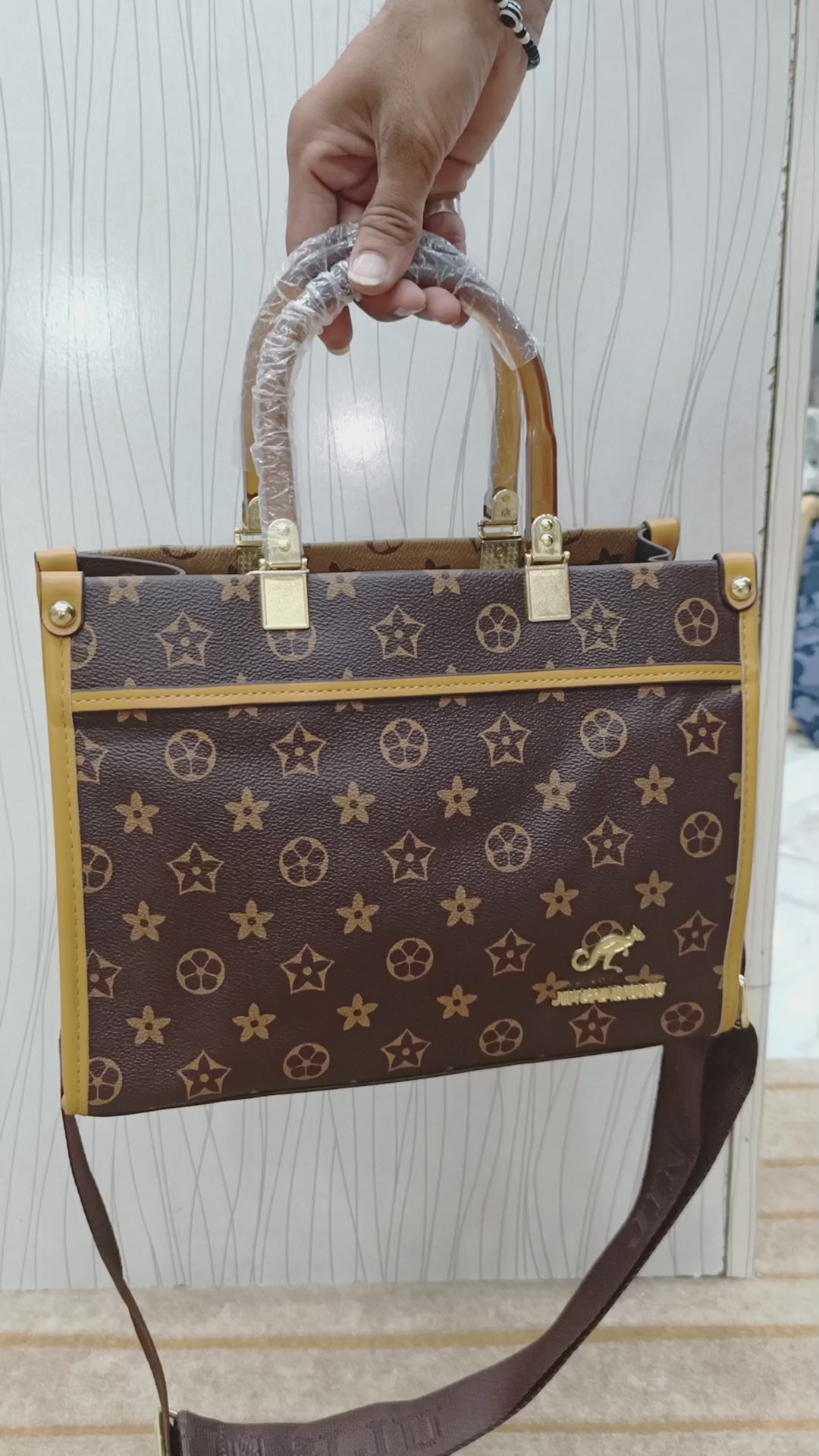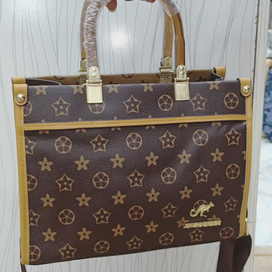 Design: A structured, rectangular silhouette with an eye-catching brown monogram pattern of stars and circular motifs. The front of the bag is accented with a gold-tone kangaroo logo Handles & Straps: It includes sturdy dual top handles wrapped for comfort (likely with a protective plastic covering, as shown) secured by elegant gold-tone hardware. It also comes with a detachable and adjustable wide shoulder strap in a complementary tan and brown color, offering versatile carrying options (handheld, shoulder, or crossbody).